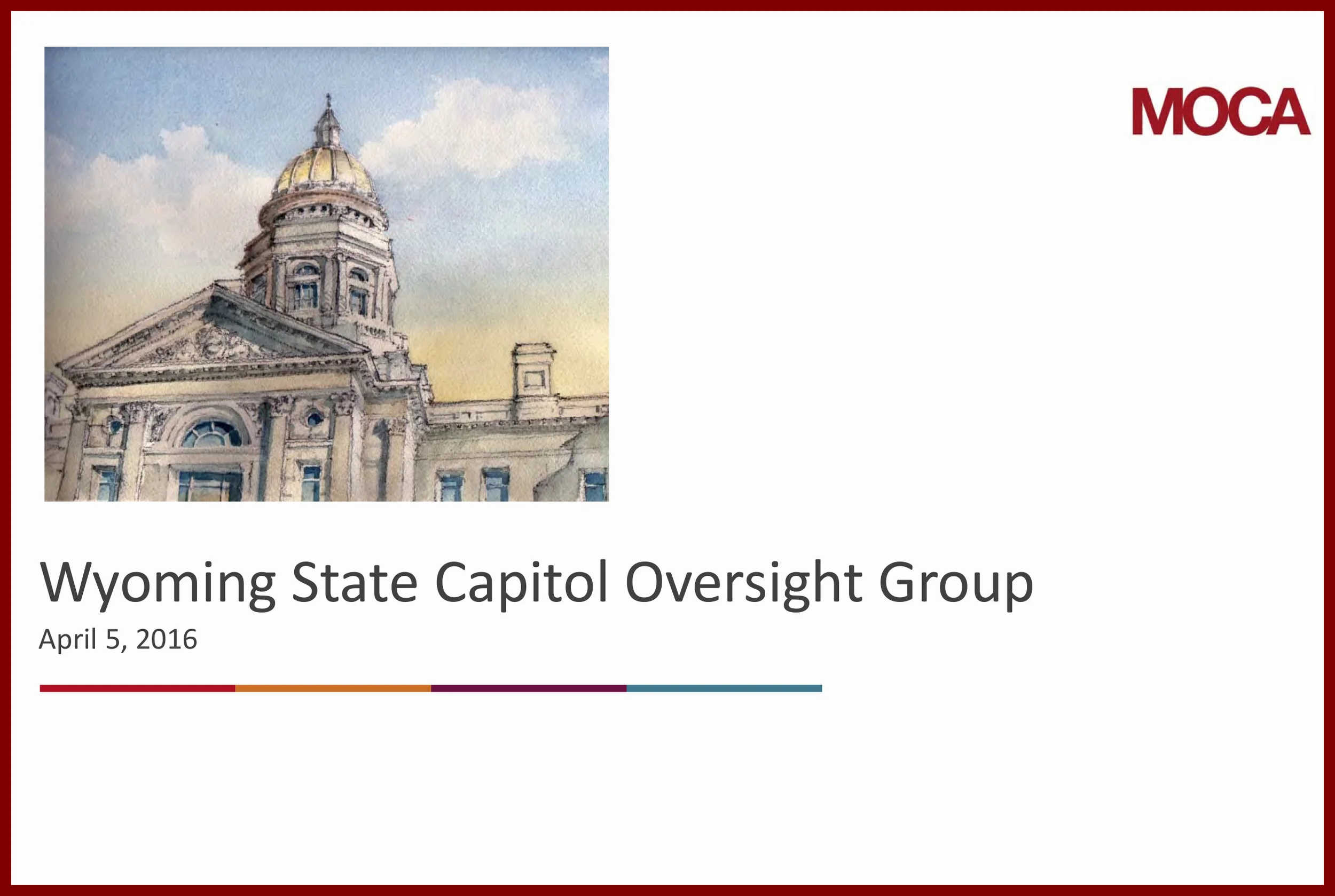 /The Capitol Building Restoration Oversight Group met on April 5, 2016. The purpose of the meeting was to discuss the Capitol Square Project and develop recommendations for presentation to, and consideration by, the full Oversight Group regarding Capitol design, Herschler Building design, Capitol Extension design, project audio/visual requirements, site design, and master planning.