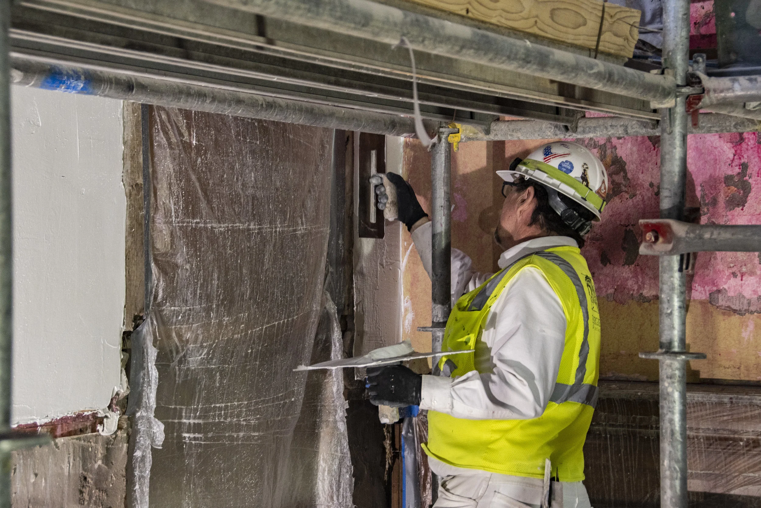 Plaster artisans with EverGreene Architectural Arts are repairing the plaster walls of the two-story historic Supreme Court Chamber in preparation for the restoration of the 1888 decorative paint patterns.