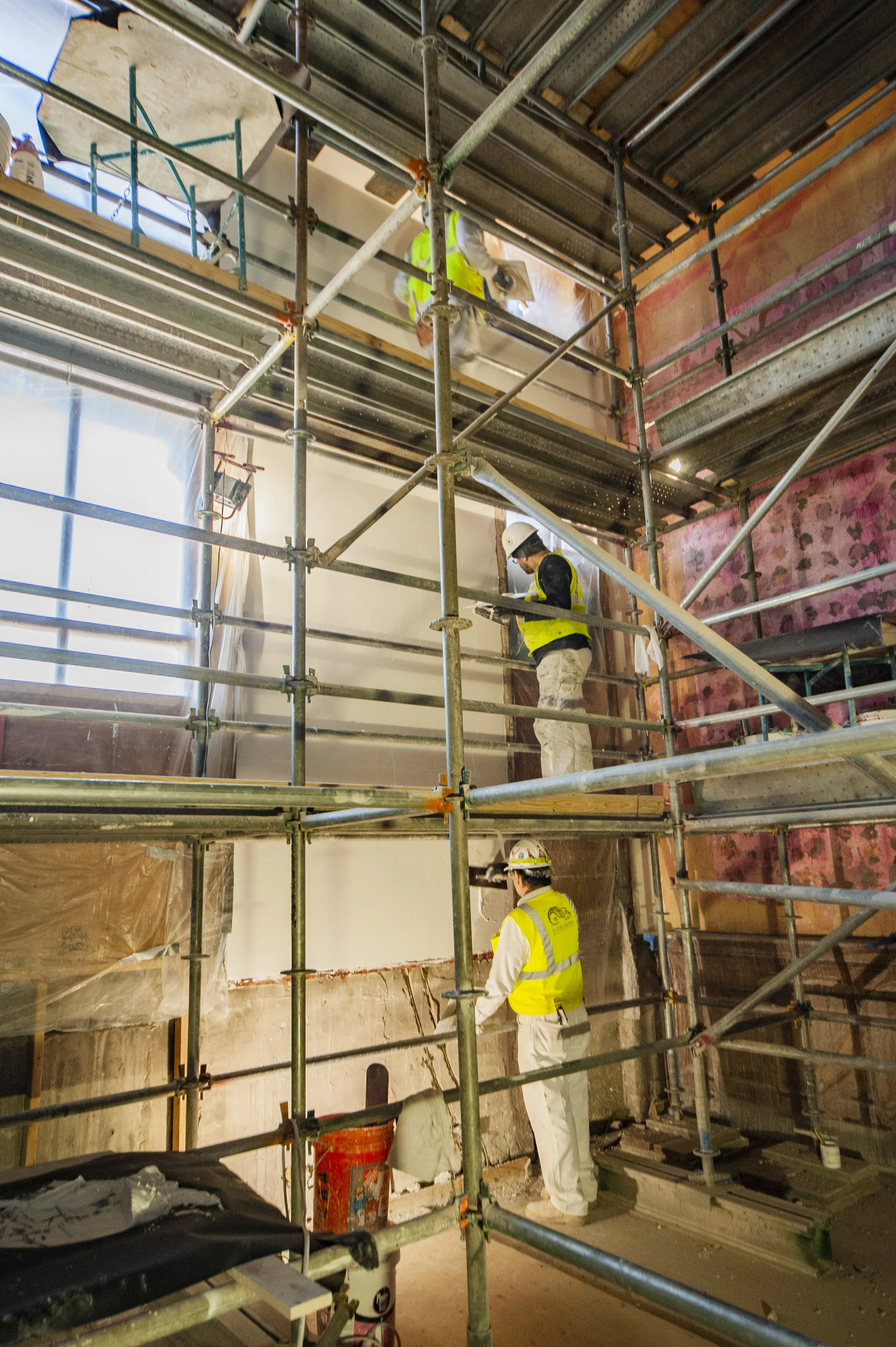 / Guest UserPlaster artisans with EverGreene Architectural Arts are repairing the plaster walls of the two-story historic Supreme Court Chamber in preparation for the restoration of the 1888 decorative paint patterns.