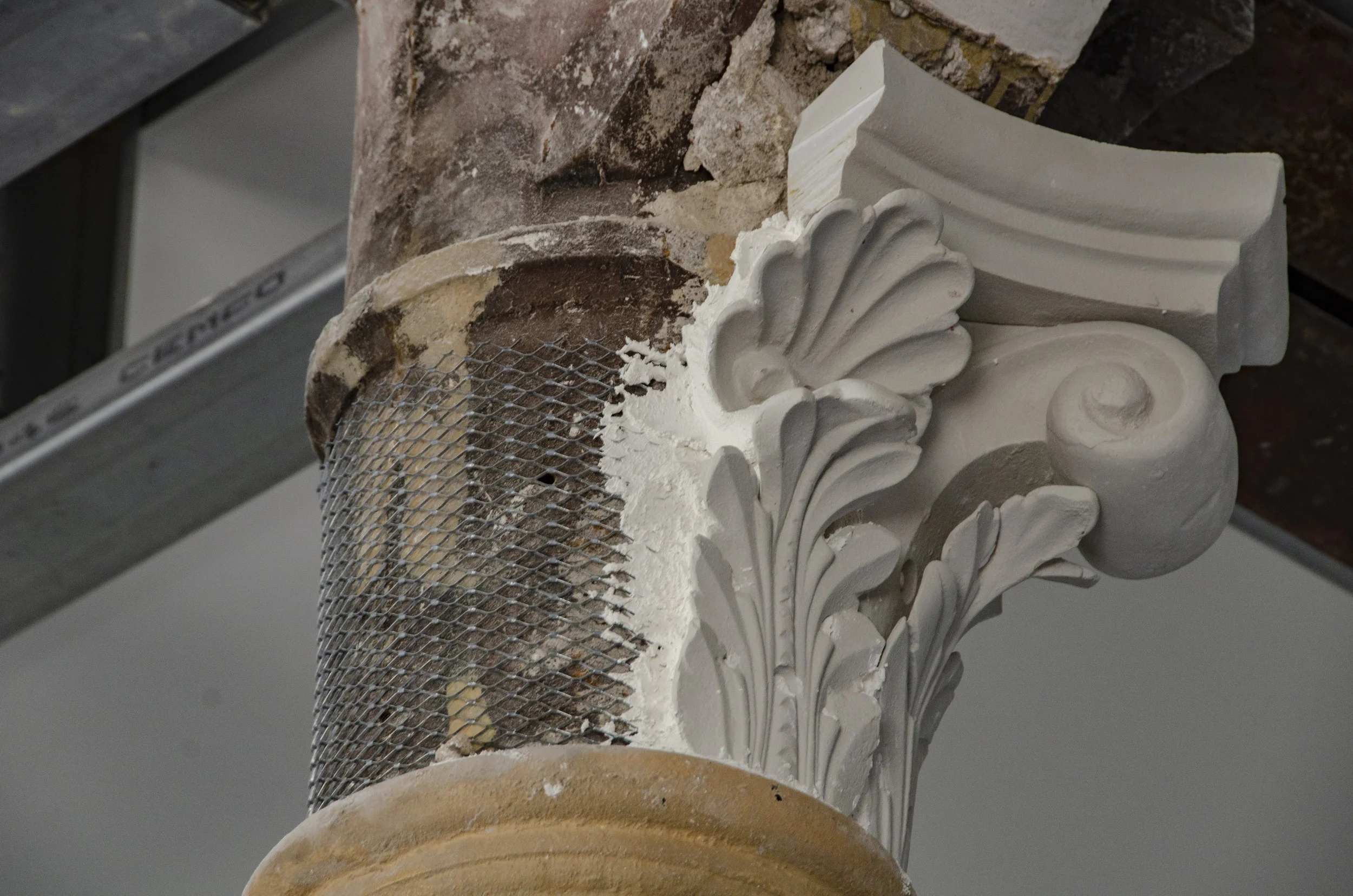 This piece of capital is made from a mold of an 1890 Corinthian acanthus leaf capital found on the first floor. The piece has been installed to confirm elevations in preparation for the beam installation in the room.