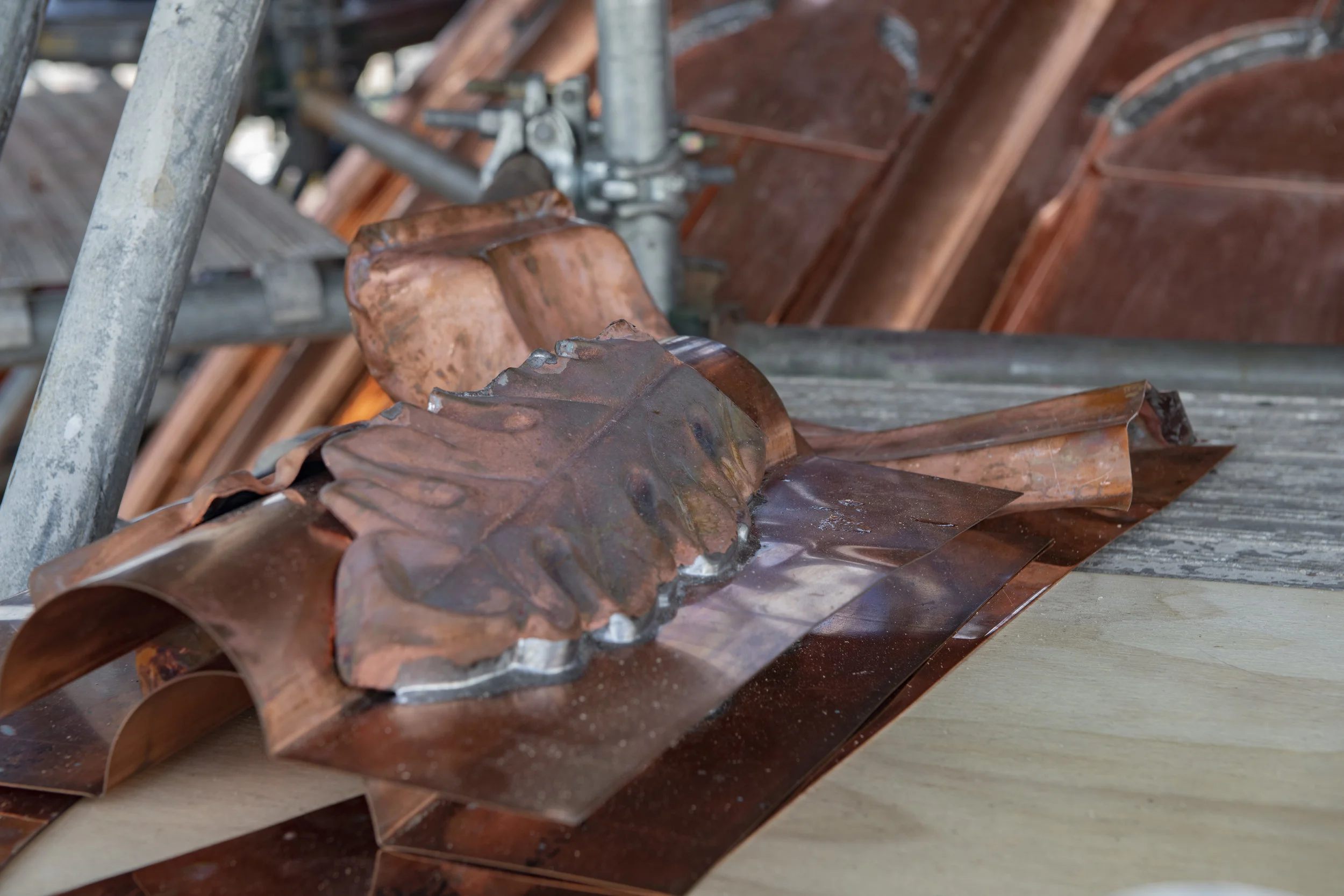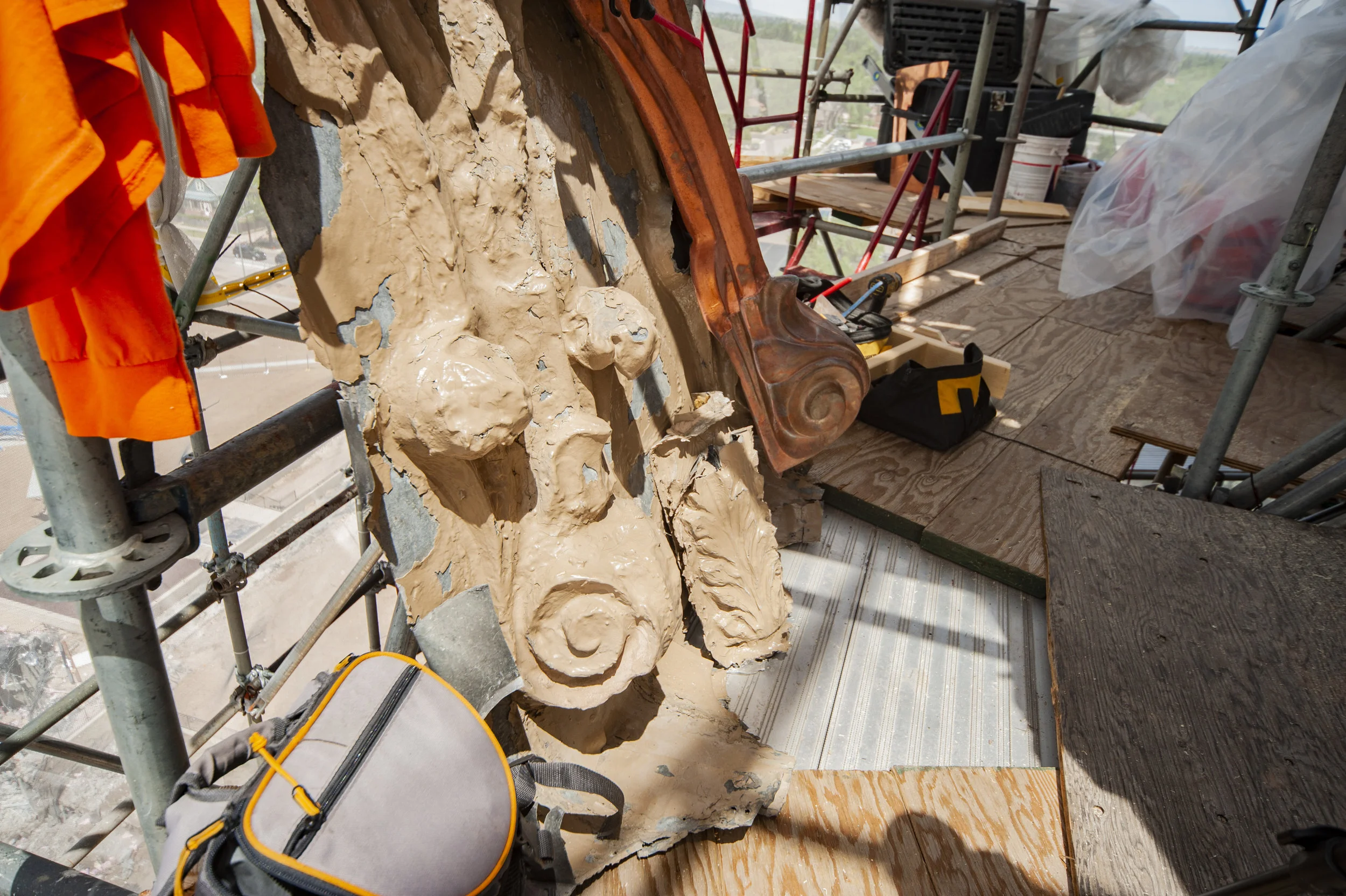 Craftsmen with Renaissance Roofing, Inc. finished the decorative pieces on the lower sections of the Capitol dome. Due to extensive damage, the original pieces were removed and recreated from copper.