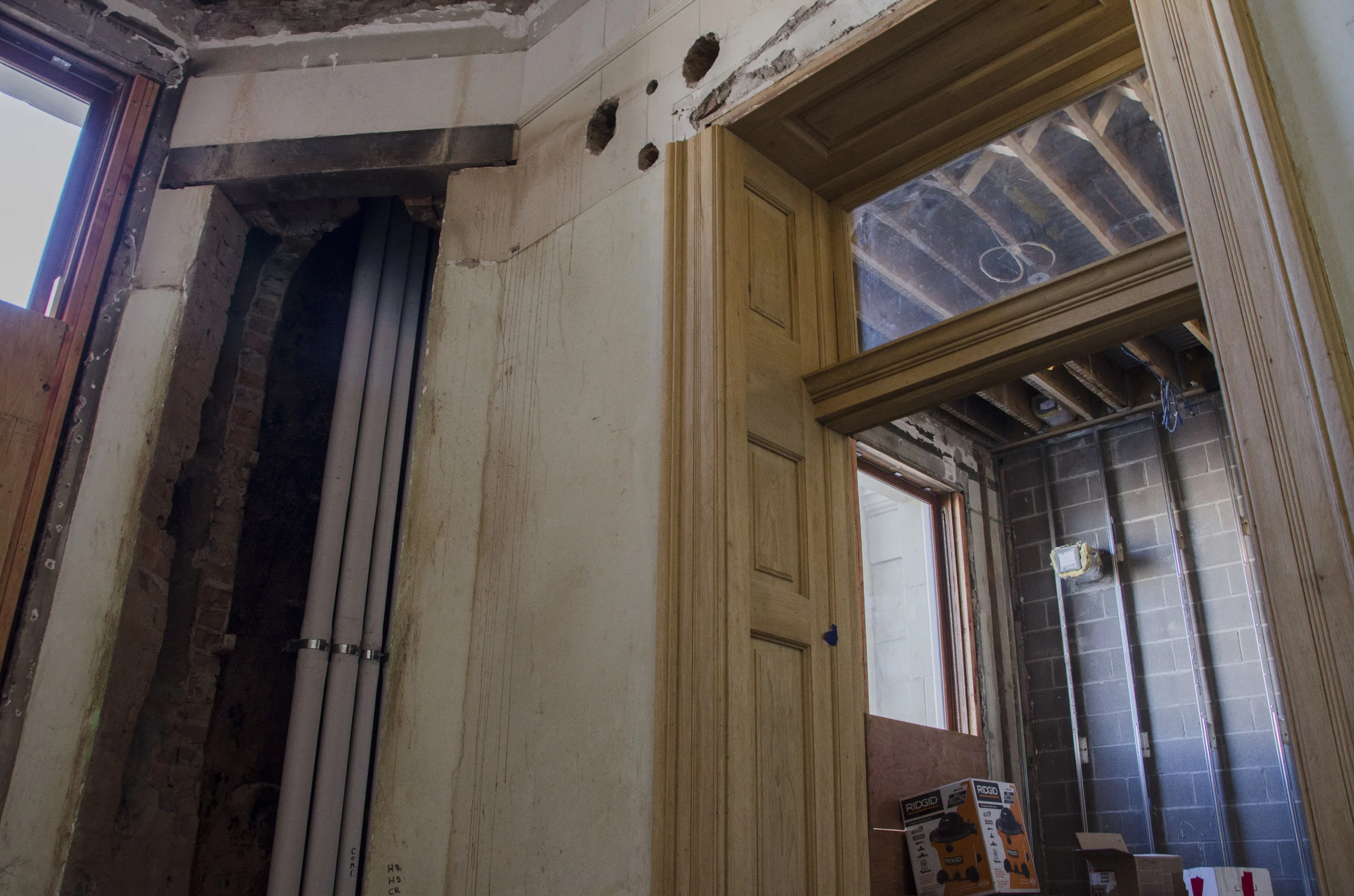 Door casings are being installed on the second floor. The old fireplace flues are being re-purposed as pathways for new piping and ductwork.