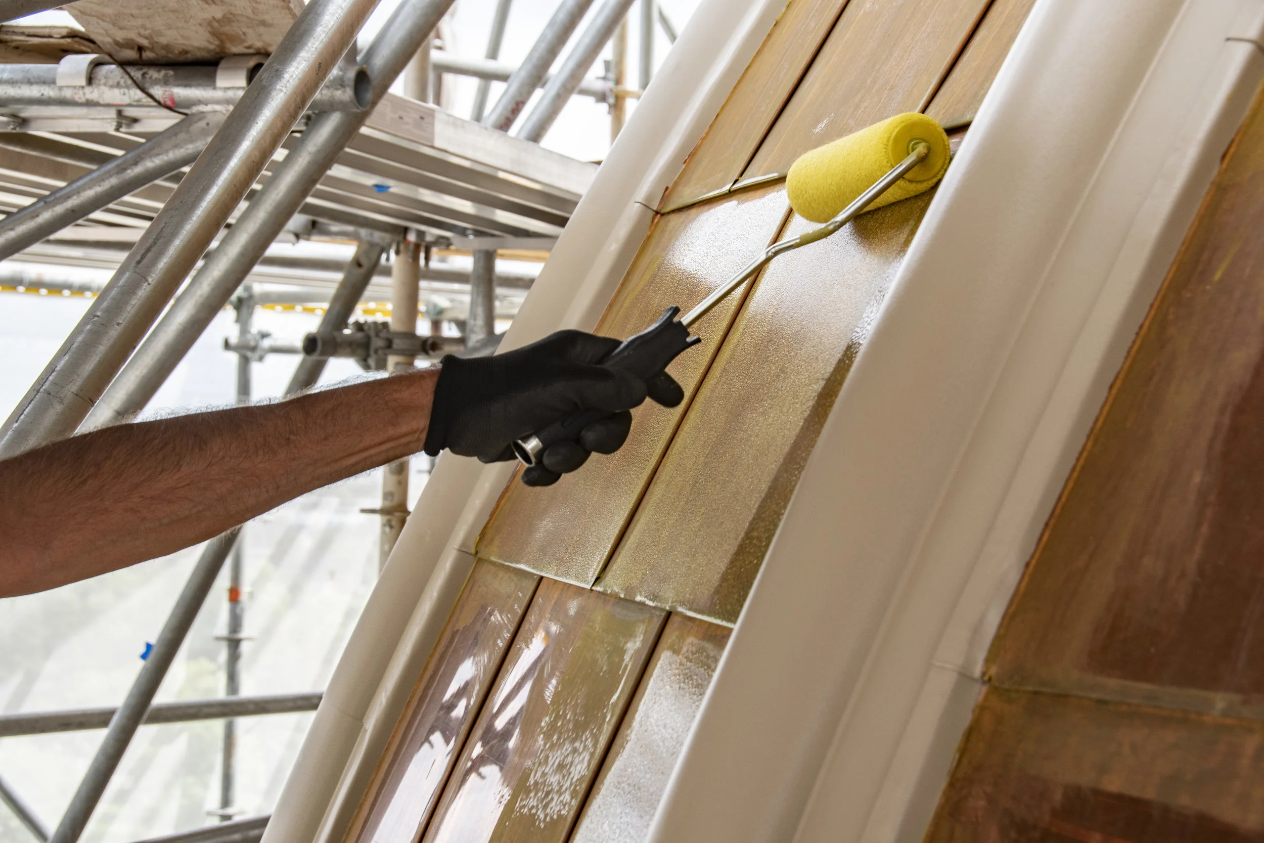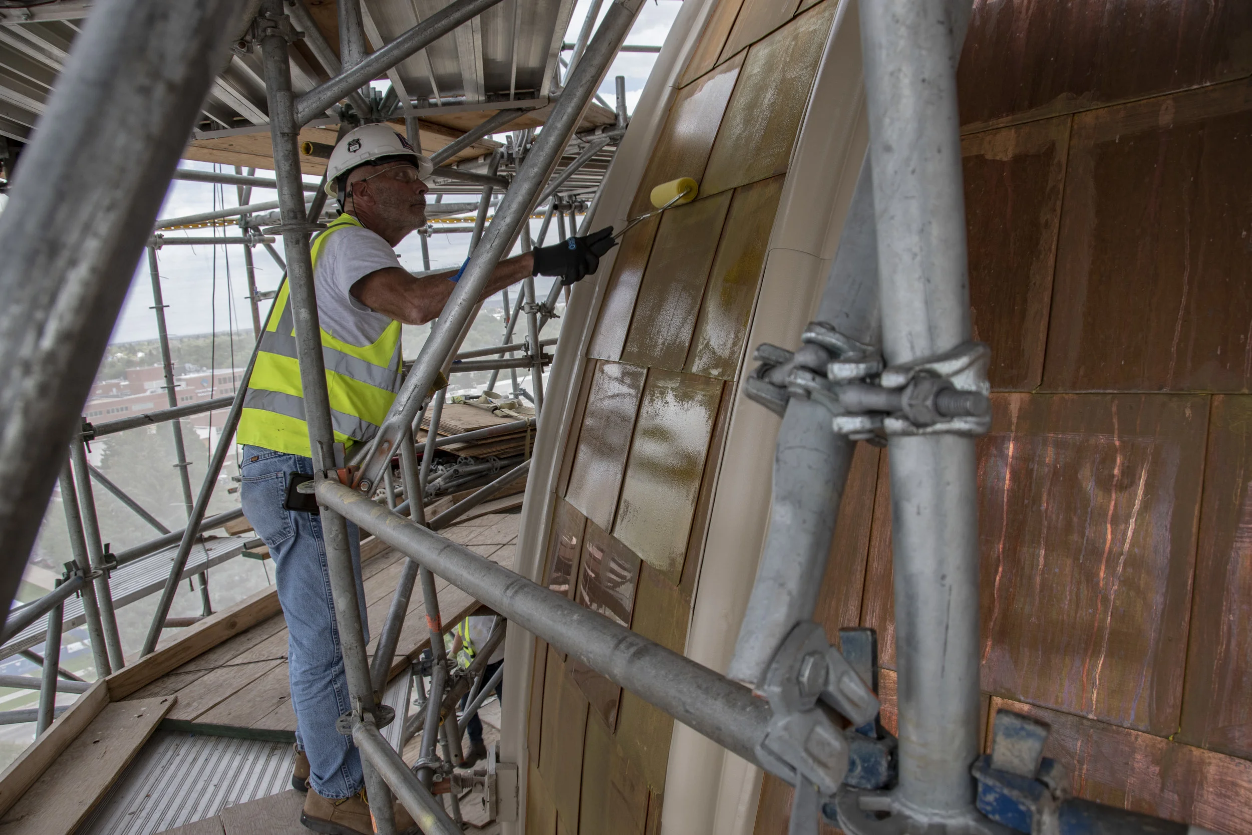 Just below the decorative elements on the dome, the wooden parts of the drum have been replaced with steel.