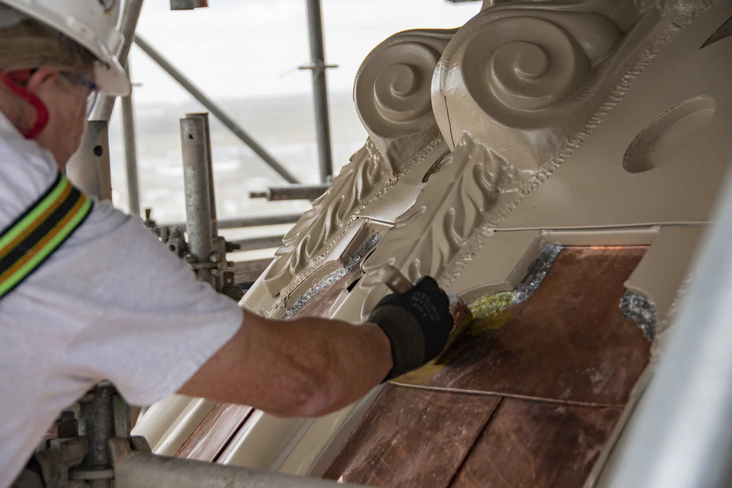 Craftsmen with Renaissance Roofing, Inc. finished the decorative pieces on the lower sections of the Capitol dome. Due to extensive damage, the original pieces were removed and recreated from copper.