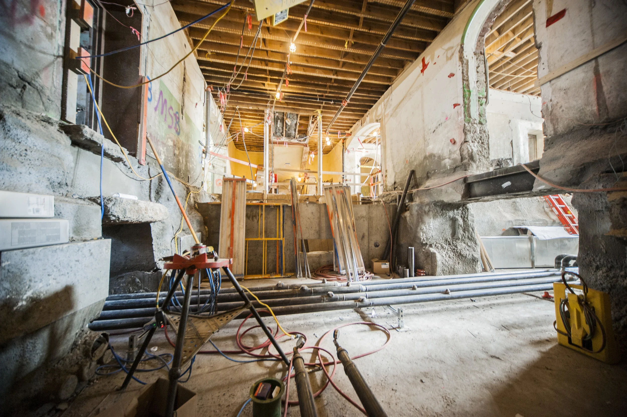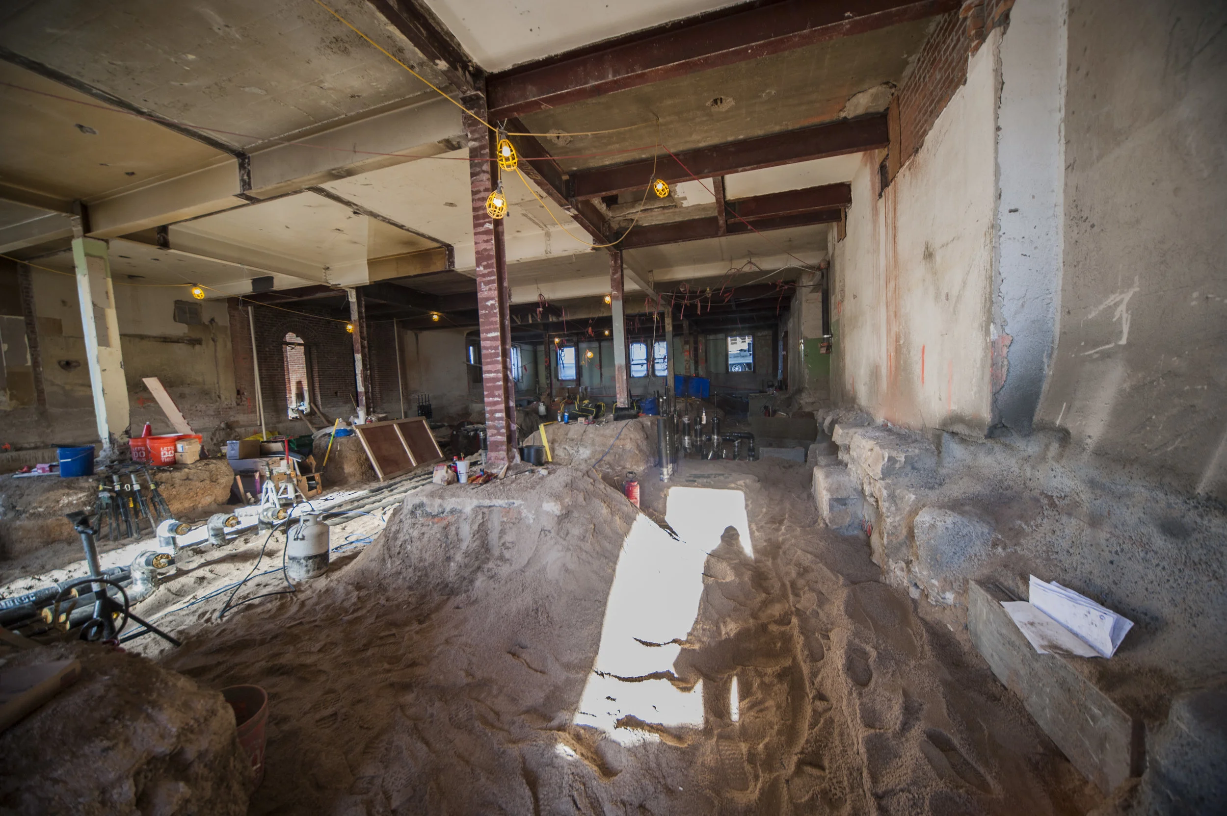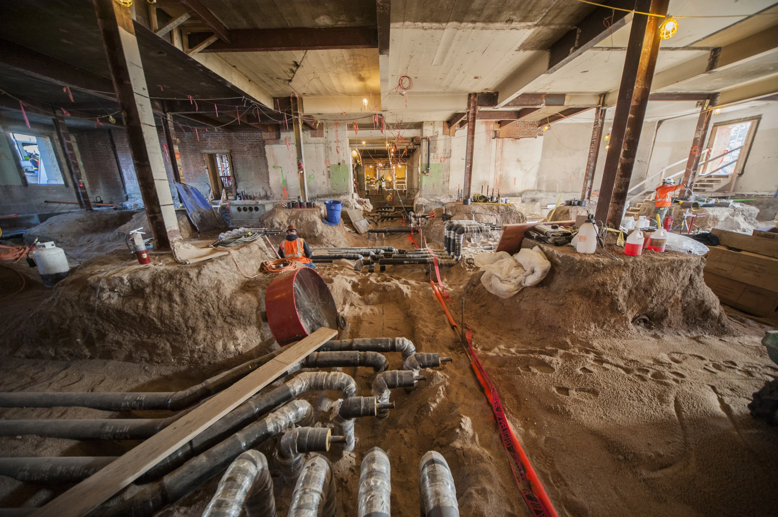 The garden level in the west wing has been excavated to allow for the installation of mechanical piping beneath the floor.