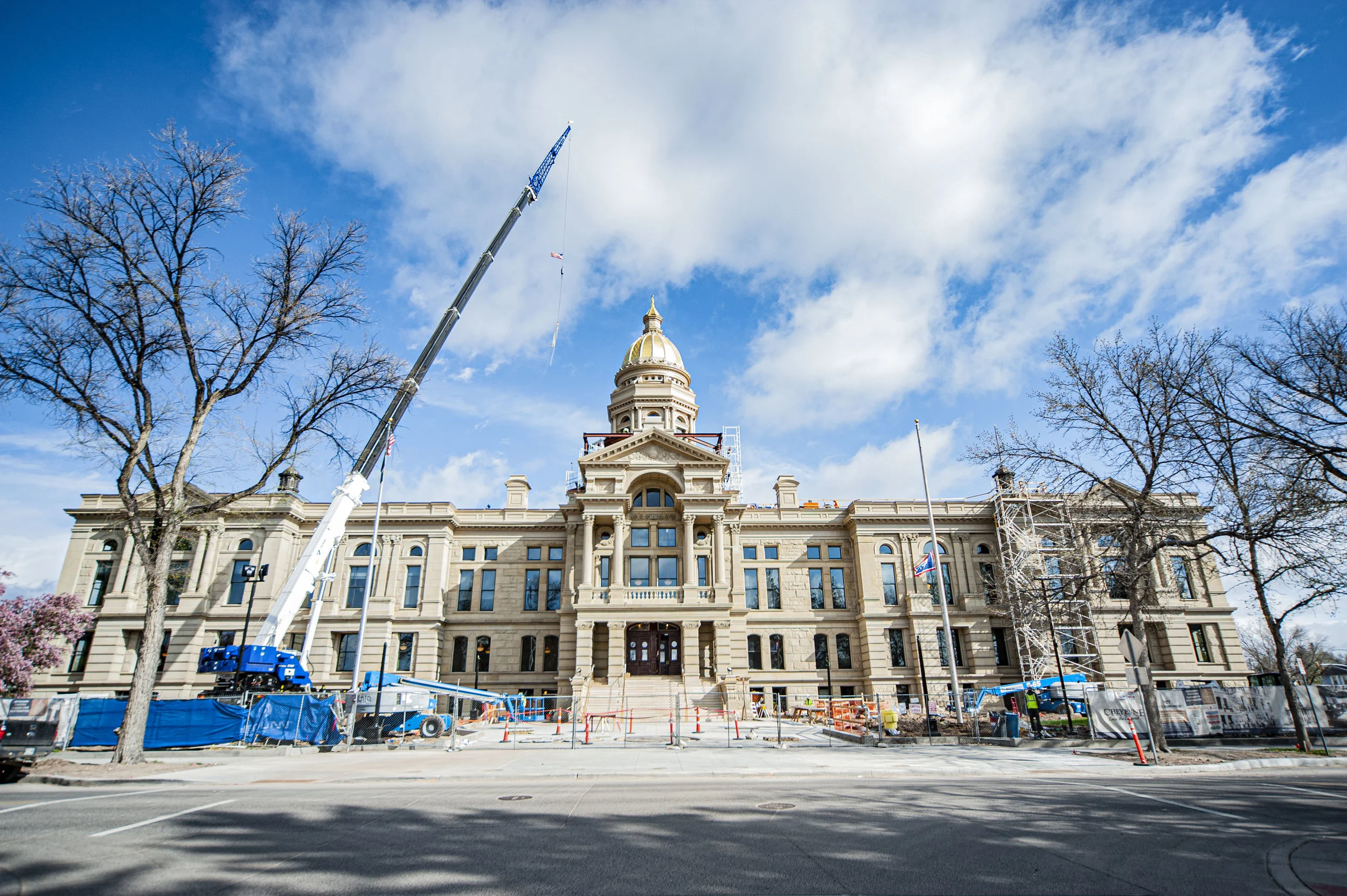 The dome scaffolding was installed in September 2017 and a white covering was added to help facilitate the repairs and improve safety. Behind the covering, extensive work was done to replace and repair of the existing decorative sheet metal, repair the roof, and re-gild of the dome. The repairs will extend the life expectancy of the dome by over 75 years.